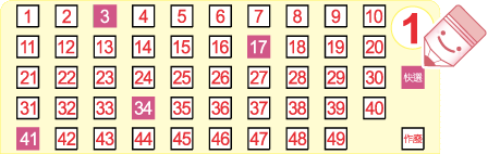您也可以在選號區中選擇1~5個號碼,並劃記「快選」,投注機將隨機為你選出剩下的號碼,產生一組6個號碼。 以下圖為例,如果您只選擇3、17、34、41等四個號碼,並劃記「快選」,剩下二個號碼將由投注機隨機快選產生。