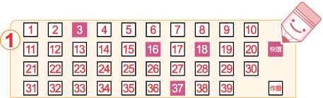 您也可以在選號區中選擇1~4個號碼,並劃記「快選」,投注機將隨機為你選出剩下的號碼,產生一組5個號碼。 以下圖為例,如果您只選擇3、16、18、37 等四個號碼,並劃記「快選」,剩下一個號碼將由投注機隨機快選產生。