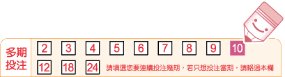 2: 如投注多期,則總投注金額為原投注金額乘以投注期數之總和。